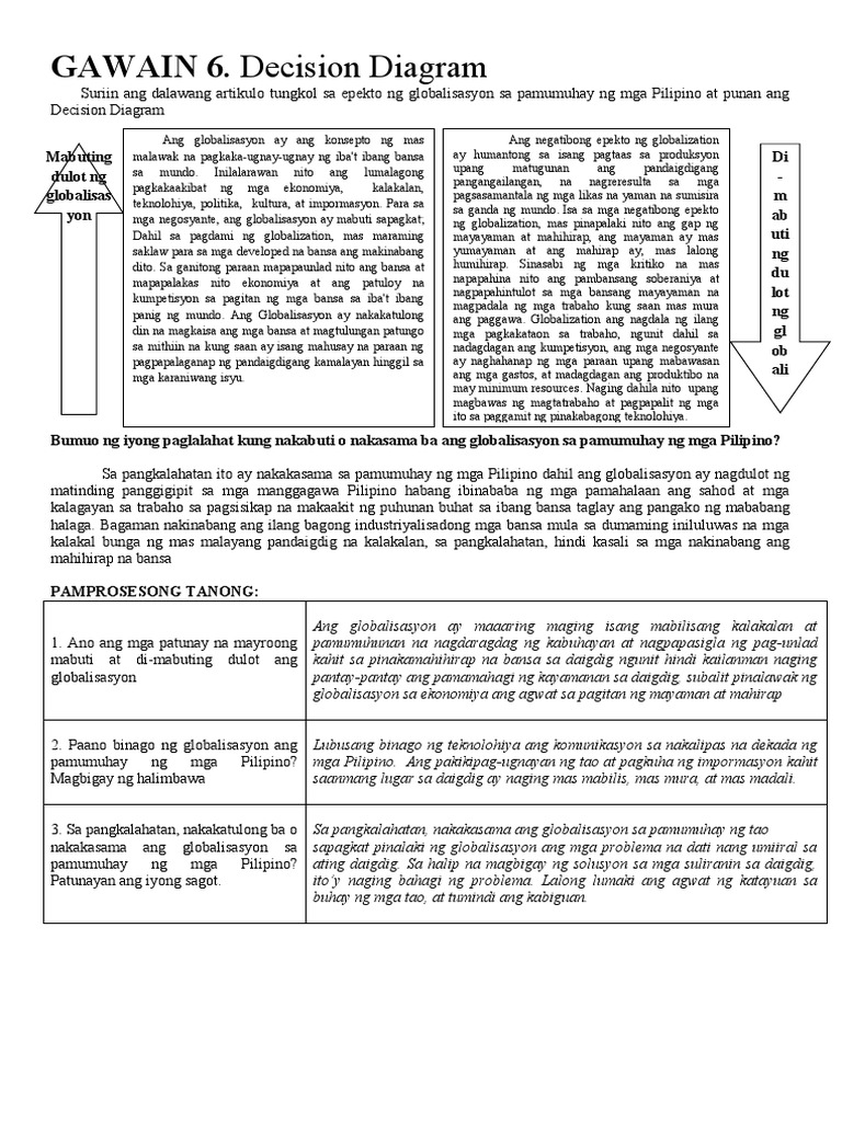 Matutunan ang ilan sa mga pamantayang internasyonal dala ng globalisasyon at tugon ng Pilipinas nito e. Mayroong mabuti at masamang epekto ang integrasyon ng mga bansa sa mundo. Parehas din sila ng sweldo at presyo ng produkto.