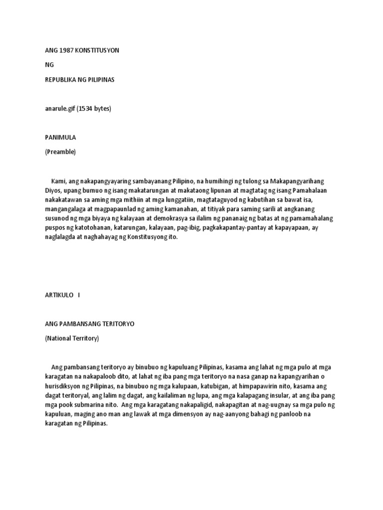 2 Dapat tamasahin ang kalagayang akademiko sa lahat ng mga institusyon ng lalong mataas na karunungan. Kami ang nakapangyayaring sambayanang Pilipino na humihingi ng tulong sa Makapangyarihang Diyos upang bumuo ng isang makatarungan at makataong lipunan at magtatag ng isang Pamahalaan na kakatawan sa aming mga mithiin at mga lunggatiin magtataguyod ng kabutihan ng bawat isa mangangalaga at magpapaunlad ng aming kamanahan at titiyak para sa. Ukol sa mga layunin ng komunikasyon at pagtuturo ang mga wikang opisyal ng Pilipinas ay Filipino at hanggat walang ibang itinatadhana ng batas Ingles.