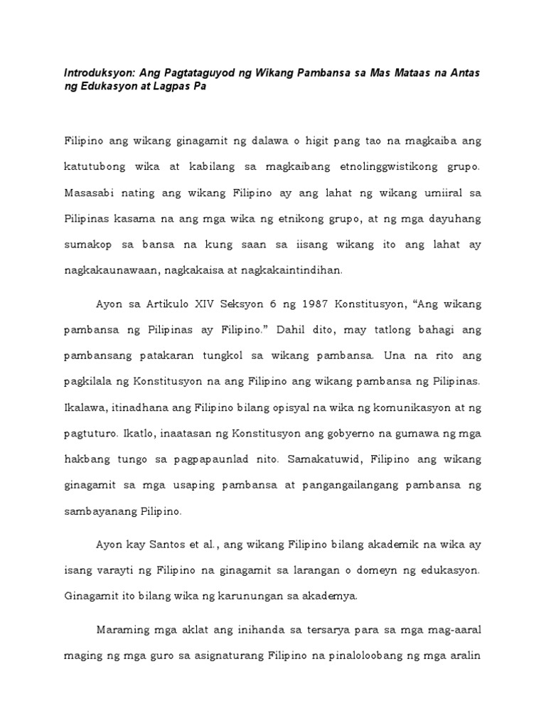 Batay sa Konstitusyon 1987 Artikulo XIV Seksyon 6 ang wikang pambansa ng Pilipinas ay Filipino. Ang pagkakaroon ng isang mataas at matibay na edukasyon ay isang kayamanan na kahit sino man ay hindi mananakaw nino man. Batay sa Bayon sa Dsang-ayon sa - 3080432.
