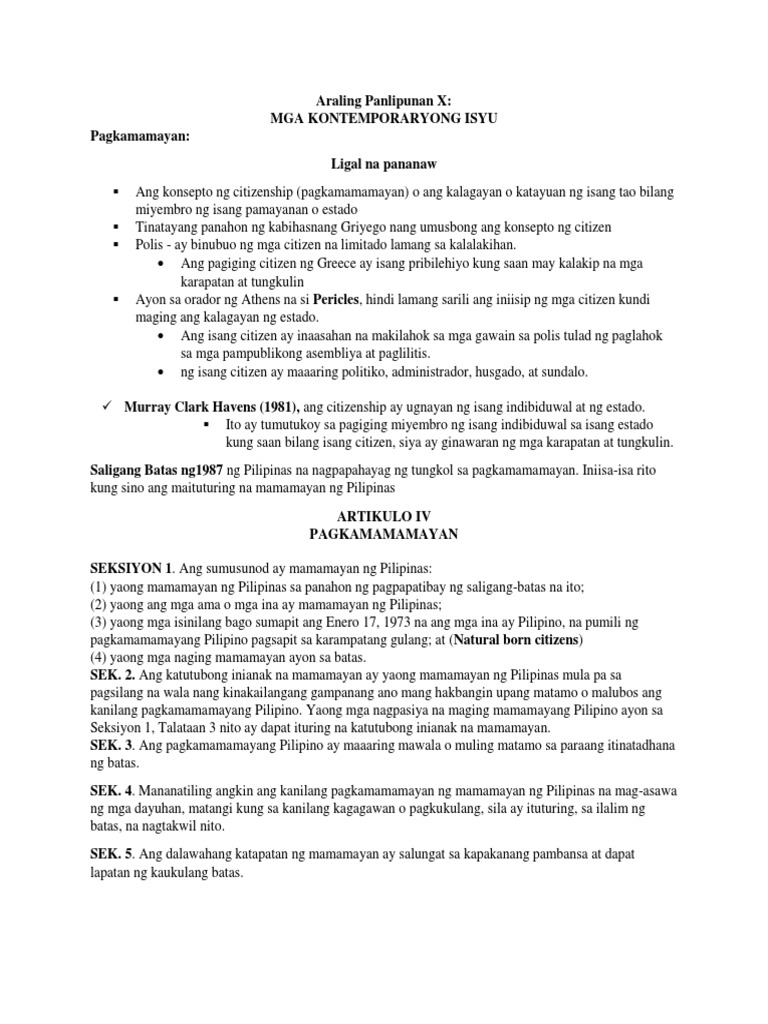 1Mamamayan ng Pilipinas nang pinagtibay ang Saligang Batas ng 1987 noong Pebrero 2 1987 2Ang ama o ina ay mamamayang Pilipino 3Mga mamamayang isinilang bago sumapit ang Enero 17 1973 sa mga inang Pilipino na pinili ang pagkamamamayang Pilipino pagsapit ng 21 taong gulang 4Mga dayuhang nagpasiyang maging mamamayang Pilipino ayon sa batas ng naturalisasyon Ang Mamamayang Pilipino. Start studying Hekasi Test. Artikulo III Seksyon 4.