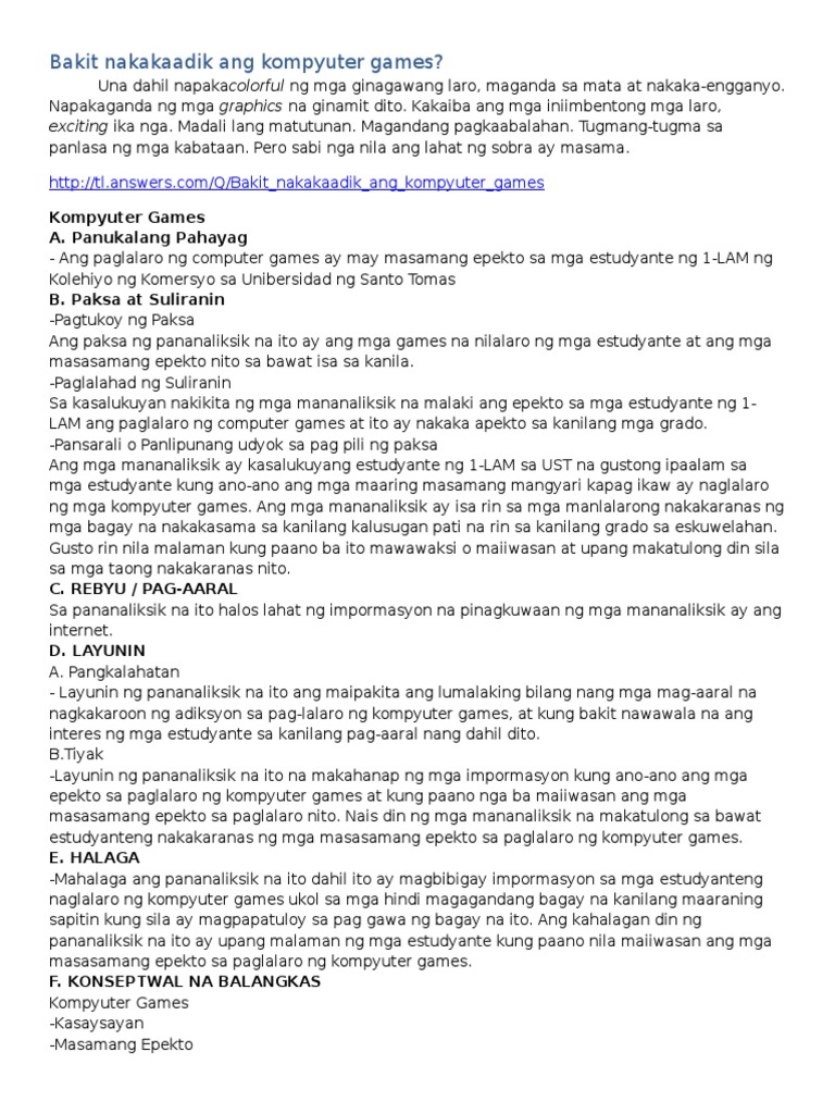 Research Paper-filipino 2 Epekto Ng Paglalaro Ng Computer sa kanyang Pananaliksik sa Filipino Ang paglalaro ng computer games ay may masamang epekto sa mga Isa namang artikulo ang nabasa ng mga mananaliksik tungkol sa kasaysayan ng kompyuter games ito Adiksyon sa kompyuter games Panukalang Pahayag- Ang paglalaro ng computer games ay may. Ang mga sandaling iginugugol natin sa paglalaro ng digital games ay katumbas sana ng panahong maaari nating ilaan sa mas makabuluhang bagay katulad ng pag-aaral pagtulong sa ating pamilya at pakikisalamuha sa ating mga mahal sa buhay. Malaman na ang paglalaro ng Online Games ay hindi makakabuti sa kanila dahil ito ay maaring makaapekto sakanilang pag-iisip at kalusugan.